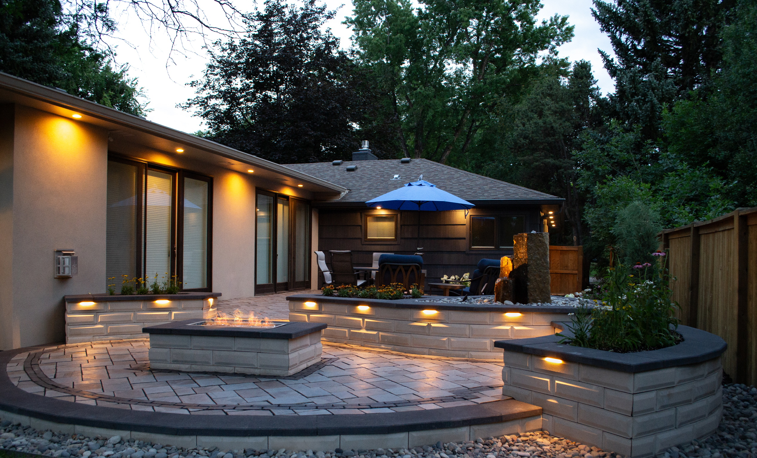 Clean and contemporary, this multi-level space tucked away in an historic downtown provides a sense of calm retreat, with a built-in custom fire pit and elevated natural stone water feature.